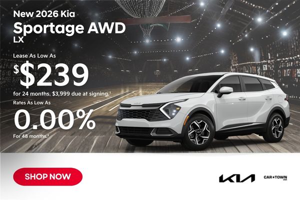 2026 Kia Sportage AWD LX, Example VIN: 5XYK33DF8TG407403, MSRP: $33,375. ¹Lease for $239 per month for 24 months with $3,999 due at signing plus tax, title, license and registration fees, any emission testing charges, $100 dealer documentation fee, and $650 lease acquisition fee. Closed end lease. No security deposit required. 10,000 miles per year. Total cost of payments: $5,736. Must qualify for all rebates and programs. Not all lessees will qualify. Option to purchase for $24,698 at lease end. Lessee is responsible for insurance, maintenance, repairs, excess wear, $400 disposition fee, and mileage charges of $0.20 per mile over 20,000 total miles. Lease available to well qualified buyers through Kia Motor Finance and is subject to credit approval. ²0.00% APR financing for 48 months. $20.83 per month per $1,000 financed at 48 months. APR financing available to well qualified buyers through Kia Finance and is subject to credit approval. Not available on balloon financing. Deferred payments offer valid on subvented APR contracts for well-qualified buyers when financed through Kia Finance. Not all will qualify. *Image for illustration purposes. Individual offers cannot be combined. Cannot be combined with other offers not listed. Offers end on 03/31/2026. Manufacturer reserves the right to change their incentives at any time without notice. See dealer for complete details.