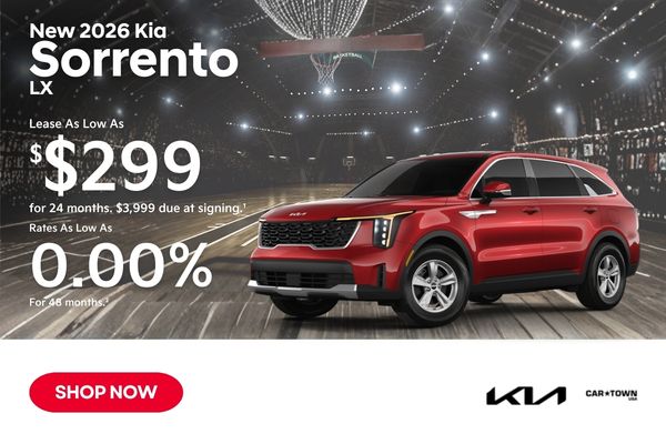 2026 Kia Sorrento LX, Example VIN: 5XYRG4JC9TG448044, MSRP: $34,810. ¹Lease for $299 per month for 24 months with $3,999 due at signing plus tax, title, license and registration fees, any emission testing charges, $100 dealer documentation fee, and $650 lease acquisition fee. Closed end lease. No security deposit required. 10,000 miles per year. Total cost of payments: $7,176. Must qualify for all rebates and programs. Not all lessees will qualify. Option to purchase for $24,715 at lease end. Lessee is responsible for insurance, maintenance, repairs, excess wear, $400 disposition fee, and mileage charges of $0.20 per mile over 20,000 total miles. Lease available to well qualified buyers through Kia Motor Finance and is subject to credit approval. ²0.00% APR financing for 48 months. $20.83 per month per $1,000 financed at 48 months. APR financing available to well qualified buyers through Kia Finance and is subject to credit approval. Not available on balloon financing. Deferred payments offer valid on subvented APR contracts for well-qualified buyers when financed through Kia Finance. Not all will qualify. *Image for illustration purposes. Individual offers cannot be combined. Cannot be combined with other offers not listed. Offers end on 03/31/2026. Manufacturer reserves the right to change their incentives at any time without notice. See dealer for complete details.
