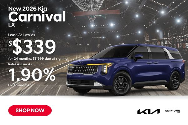 2026 Kia Carnival LX, Example VIN: KNDNB5K32T6618412, MSRP: $39,685. ¹Lease for $339 per month for 24 months with $3,999 due at signing plus tax, title, license and registration fees, any emission testing charges, $100 dealer documentation fee, and $650 lease acquisition fee. Closed end lease. No security deposit required. 10,000 miles per year. Total cost of payments: $8,136. Must qualify for all rebates and programs. Not all lessees will qualify. Option to purchase for $28,790 at lease end. Lessee is responsible for insurance, maintenance, repairs, excess wear, $400 disposition fee, and mileage charges of $0.20 per mile over 20,000 total miles. Lease available to well qualified buyers through Kia Motor Finance and is subject to credit approval. ²1.90% APR financing for 48 months. $21.65 per month per $1,000 financed at 48 months. APR financing available to well qualified buyers through Kia Finance and is subject to credit approval. Not available on balloon financing. Not all will qualify. *Image for illustration purposes. Individual offers cannot be combined. Cannot be combined with other offers not listed. Offers end on 03/31/2026. Manufacturer reserves the right to change their incentives at any time without notice. See dealer for complete details.