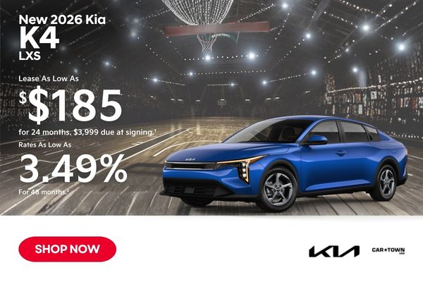 2026 Kia K4 LXS, Example VIN: 3KPFT4DEXTE296543, MSRP: $24,880. ¹Lease for $185 per month for 24 months with $3,999 due at signing plus tax, title, license and registration fees, any emission testing charges, $100 dealer documentation fee, and $650 lease acquisition fee. Closed end lease. No security deposit required. 10,000 miles per year. Total cost of payments: $4,440. Must qualify for all rebates and programs. Not all lessees will qualify. Option to purchase for $17,944 at lease end. Lessee is responsible for insurance, maintenance, repairs, excess wear, $400 disposition fee, and mileage charges of $0.20 per mile over 20,000 total miles. Lease available to well qualified buyers through Kia Motor Finance and is subject to credit approval. ²3.49% APR financing for 48 months. $22.35 per month per $1,000 financed at 48 months. APR financing available to well qualified buyers through Kia Finance and is subject to credit approval. Not available on balloon financing. Not all will qualify. *Image for illustration purposes. Individual offers cannot be combined. Cannot be combined with other offers not listed. Offers end on 03/31/2026. Manufacturer reserves the right to change their incentives at any time without notice. See dealer for complete details.