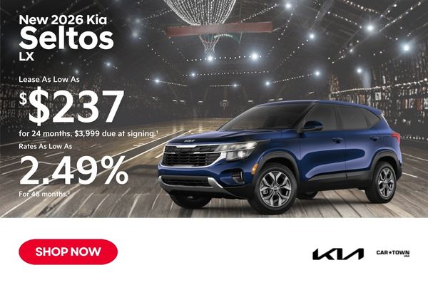 2026 Kia Seltos LX, Example VIN: KNDEP2AA8T7912715, MSRP: $25,790. ¹Lease for $237 per month for 24 months with $3,999 due at signing plus tax, title, license and registration fees, any emission testing charges, $100 dealer documentation fee, and $650 lease acquisition fee. Closed end lease. No security deposit required. 10,000 miles per year. Total cost of payments: $5,688. Must qualify for all rebates and programs. Not all lessees will qualify. Option to purchase for $17,022 at lease end. Lessee is responsible for insurance, maintenance, repairs, excess wear, $400 disposition fee, and mileage charges of $0.20 per mile over 20,000 total miles. Lease available to well qualified buyers through Kia Motor Finance and is subject to credit approval. ²2.49% APR financing for 48 months. $21.91 per month per $1,000 financed at 48 months. APR financing available to well qualified buyers through Kia Finance and is subject to credit approval. Not available on balloon financing. Not all will qualify. *Image for illustration purposes. Individual offers cannot be combined. Cannot be combined with other offers not listed. Offers end on 03/31/2026. Manufacturer reserves the right to change their incentives at any time without notice. See dealer for complete details.